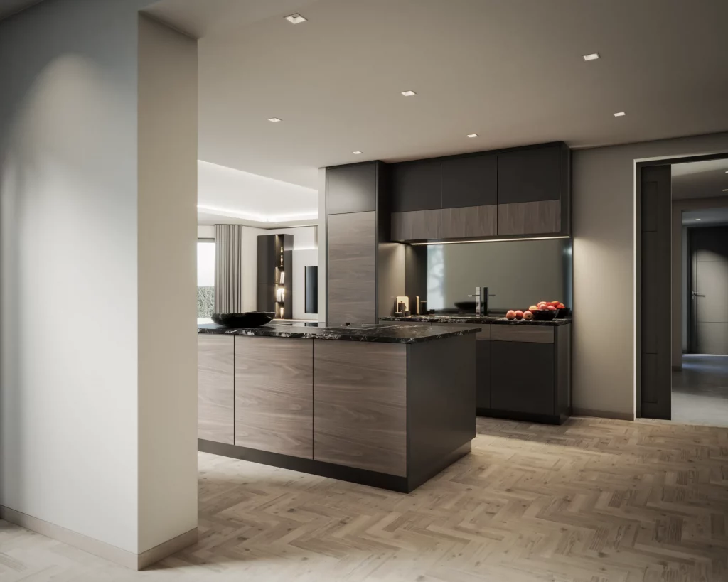 Die fertig eingebauten Kücheneinheiten unterstreichen das gesamtheitliche Wohn-