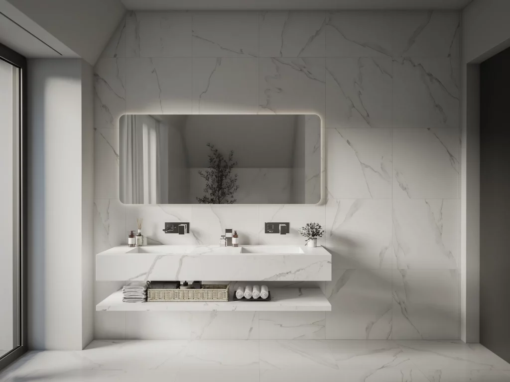 - Modernste Badezimmerausstattungen mit weisser Oberflächenästhetik, durchdachtem LED Lichtkonzept und wünschenswerten Sanitärobjekten und Designarmaturen