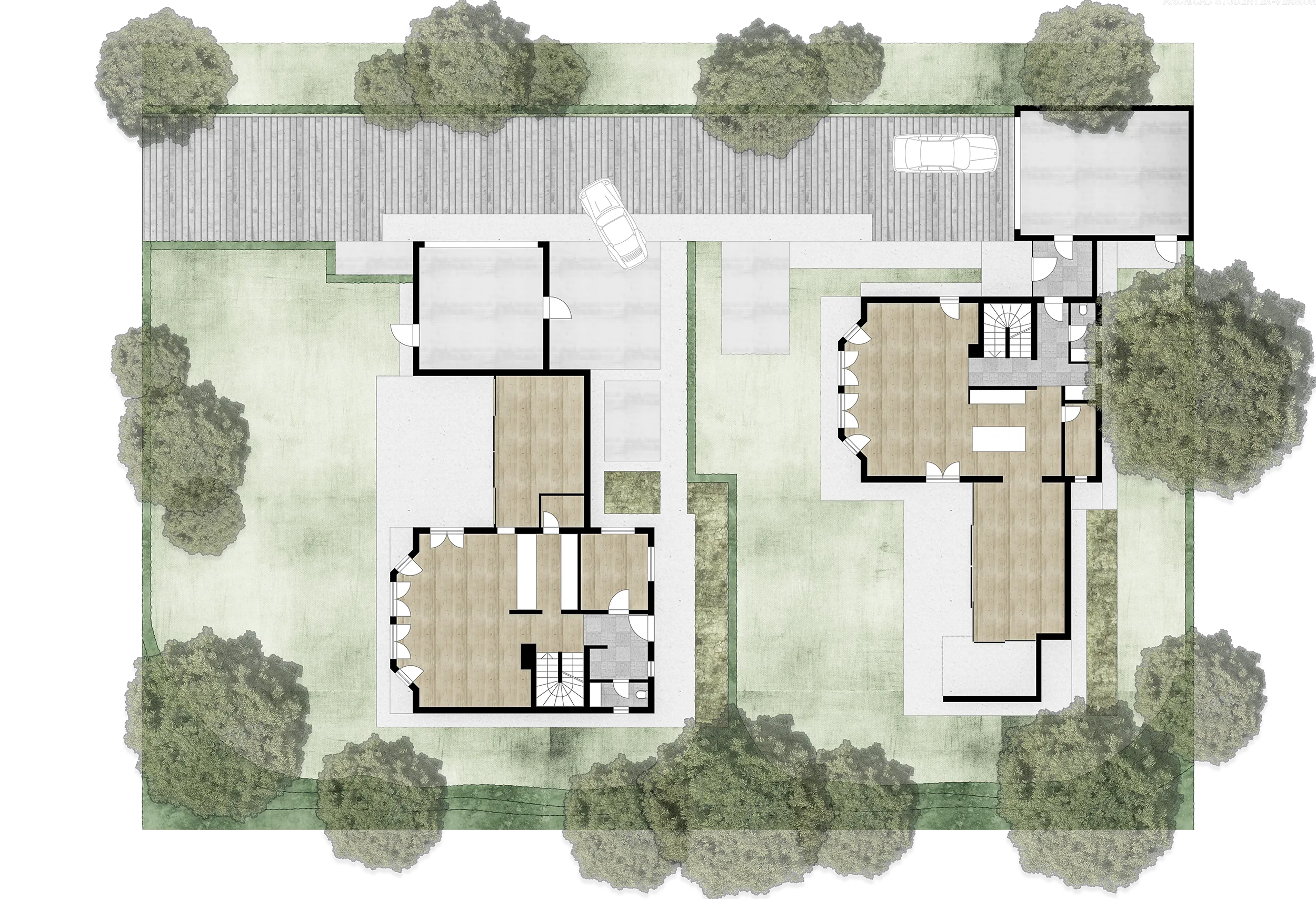Schützenswerter Baumbestand umrahmt das gesamte Grundstück. Doppelgaragen sowie pro Einheit ein weiterer Stellplatz runden das anspruchsvolle Anwesen ab.