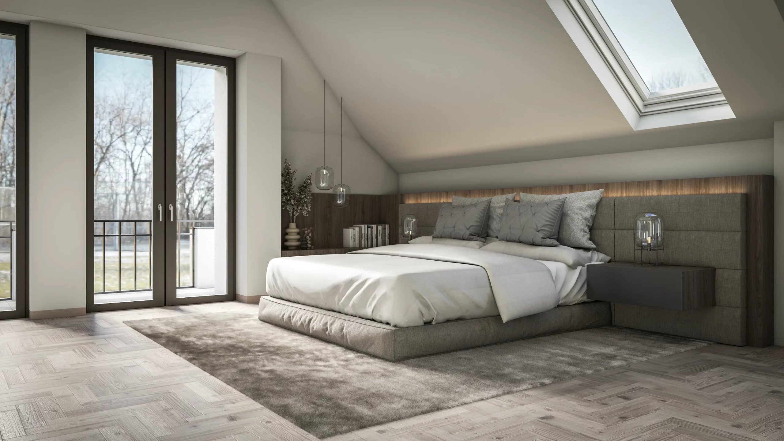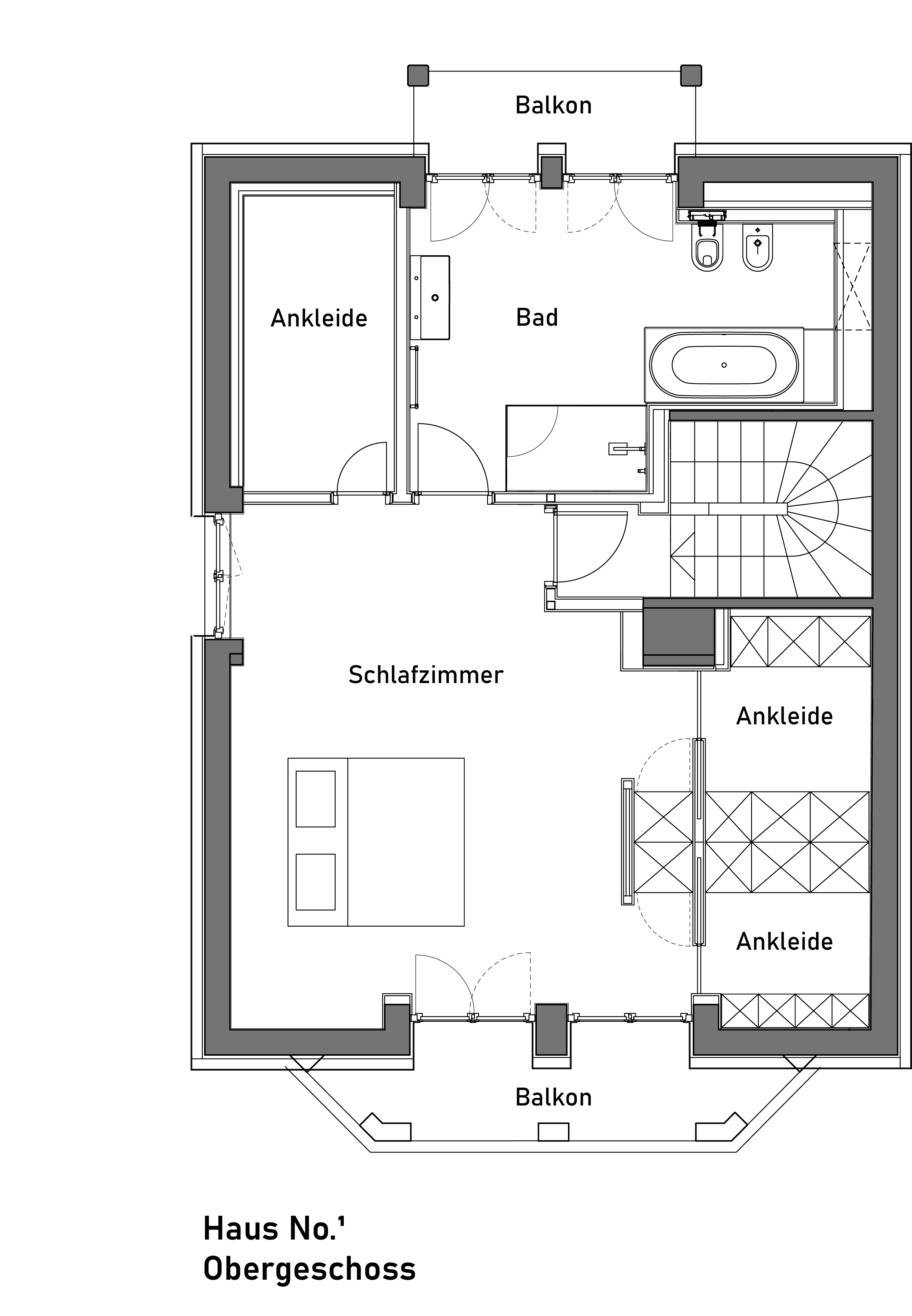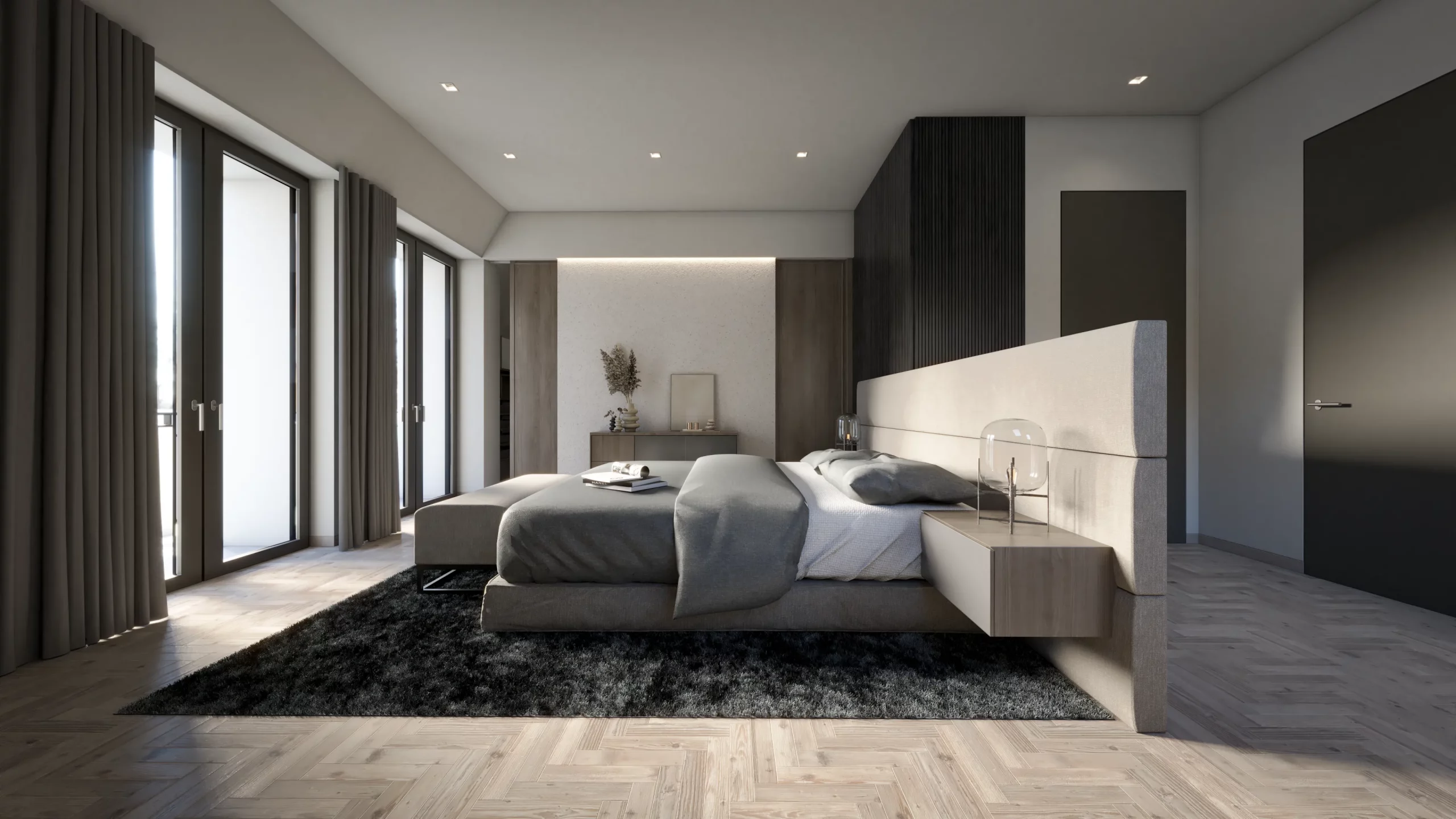 Das Obergeschoss ist als Elternbereich konzipiert. Hier befinden sich das große nach Süden ausgerichtete Schlafzimmer mit Balkonzugang, sowie ein durchdachtes fertiges Schranksystem zur direkten Nutzung. Das großzügige und hochwertige Masterbad und ein Abstellraum bzw. eine Schrankerweiterung ergänzen das Obergeschoss.