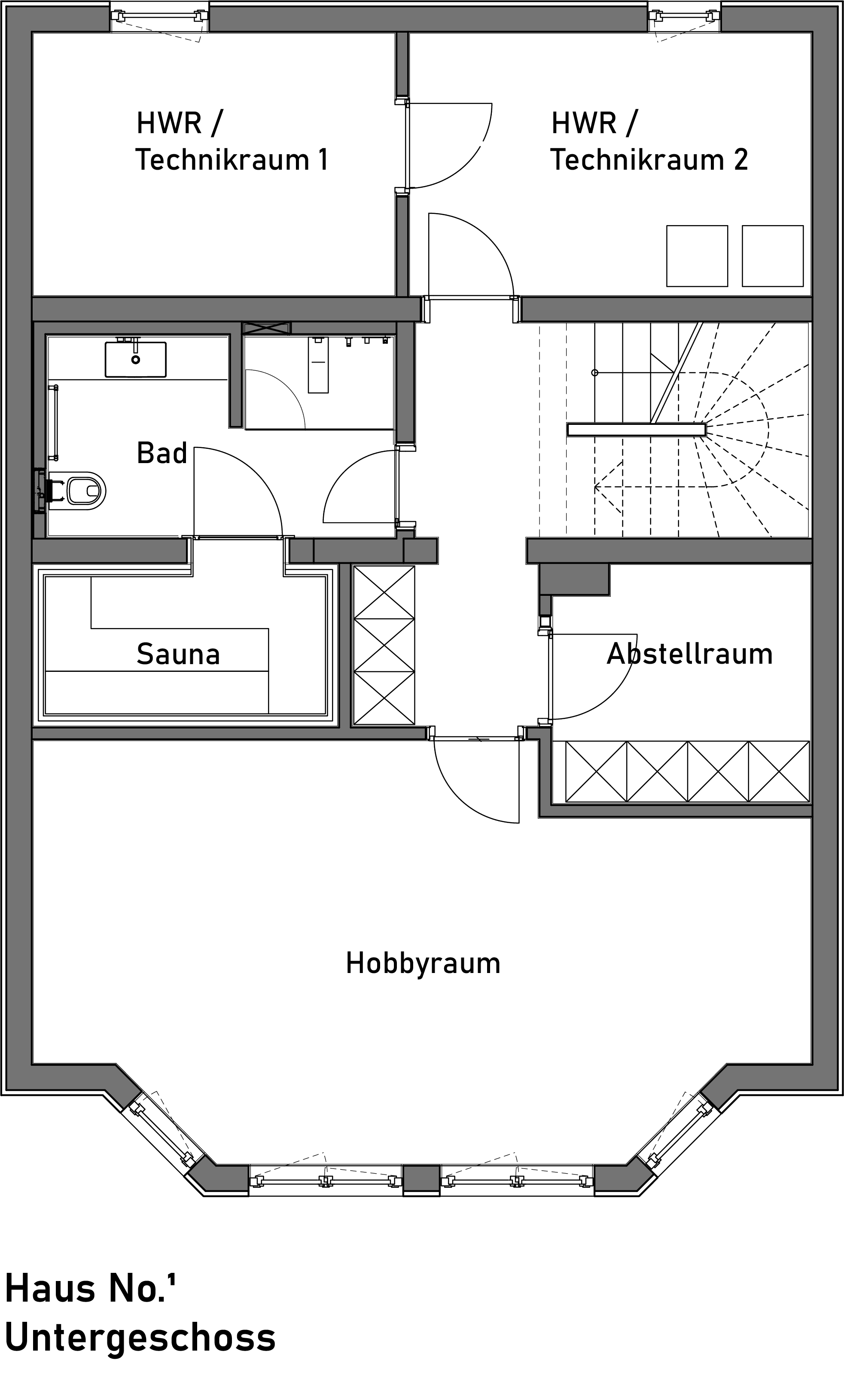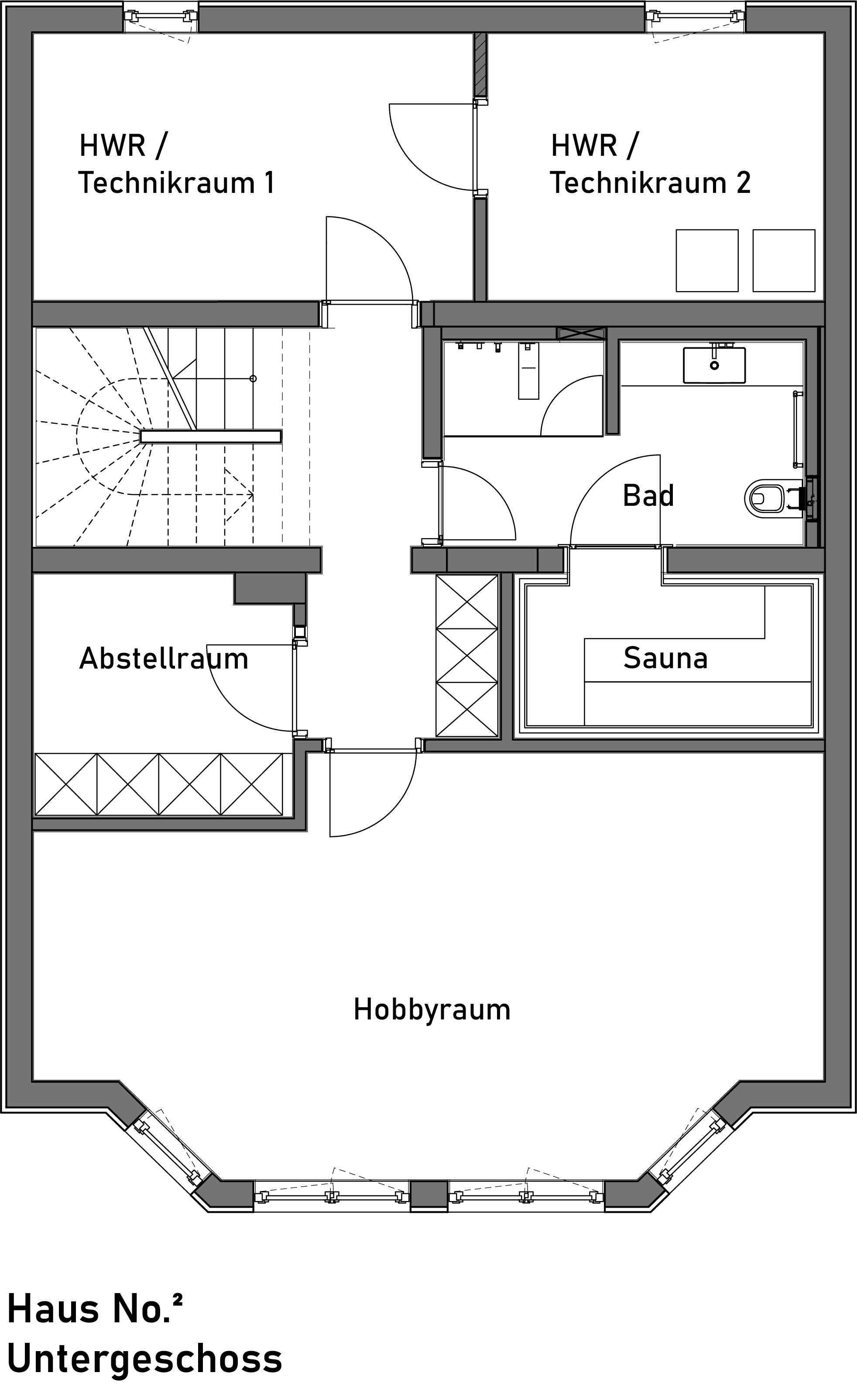 Das grosszügig gestaltete und durchdachte Untergeschoss beeinhaltet folgende Raumaufteilungen, 2 Stück HWR/ Technikraum, Badezimmer, Sauna, einen Abstellraum, sowie einen grossen Hobbyraum/ Hauptzimmer – das geräumig angesetzte Hauptzimmer, lässt sich auf Wunsch auch in zwei Einheiten unterteilen, große Lichtschächte natürlich belichtet sorgen für eine entsprechende Wohlfühlatmosphäre.