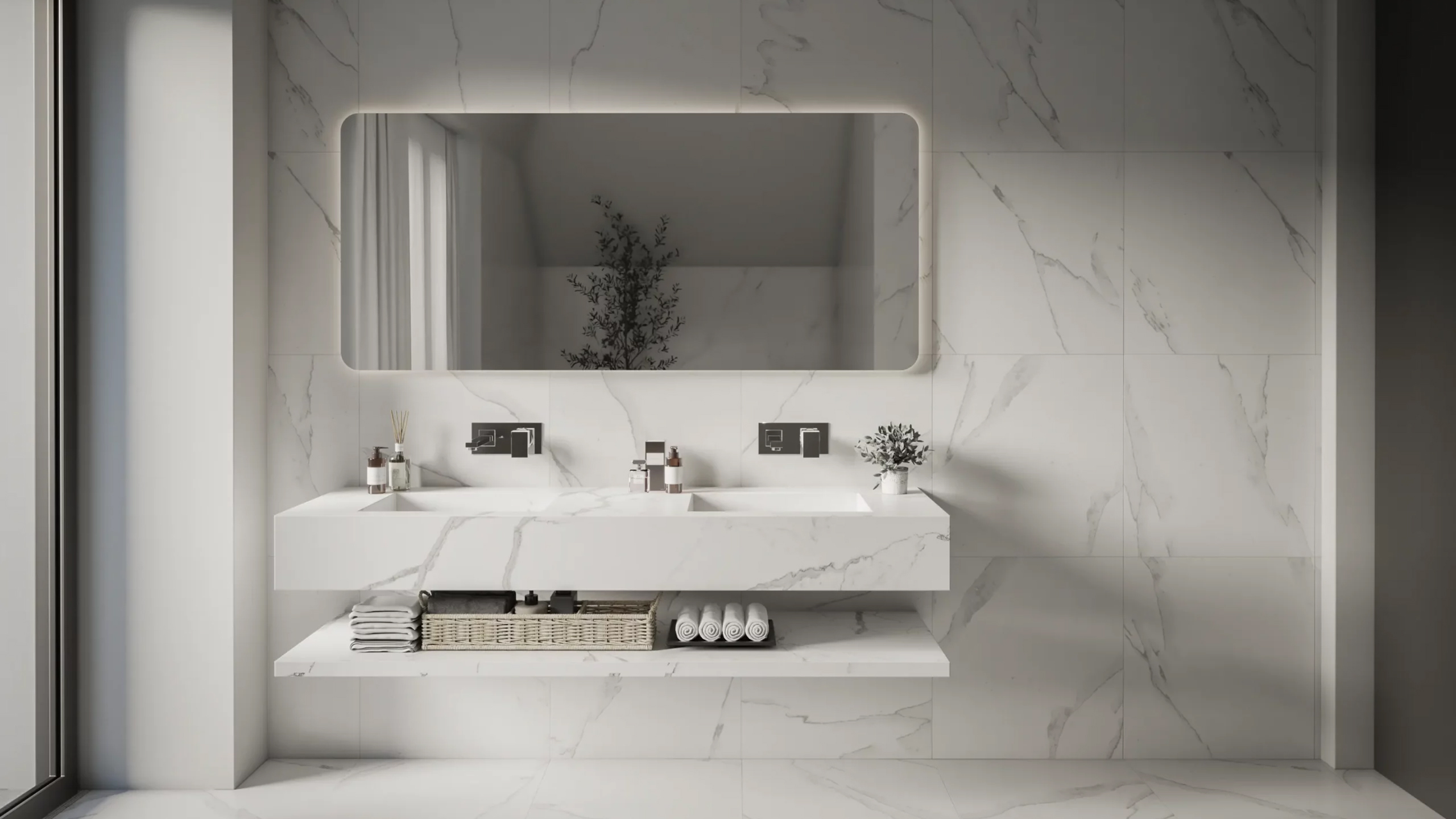 - Modernste Badezimmerausstattungen mit weisser Oberflächenästhetik, durchdachtem LED Lichtkonzept und wünschenswerten Sanitärobjekten und Designarmaturen