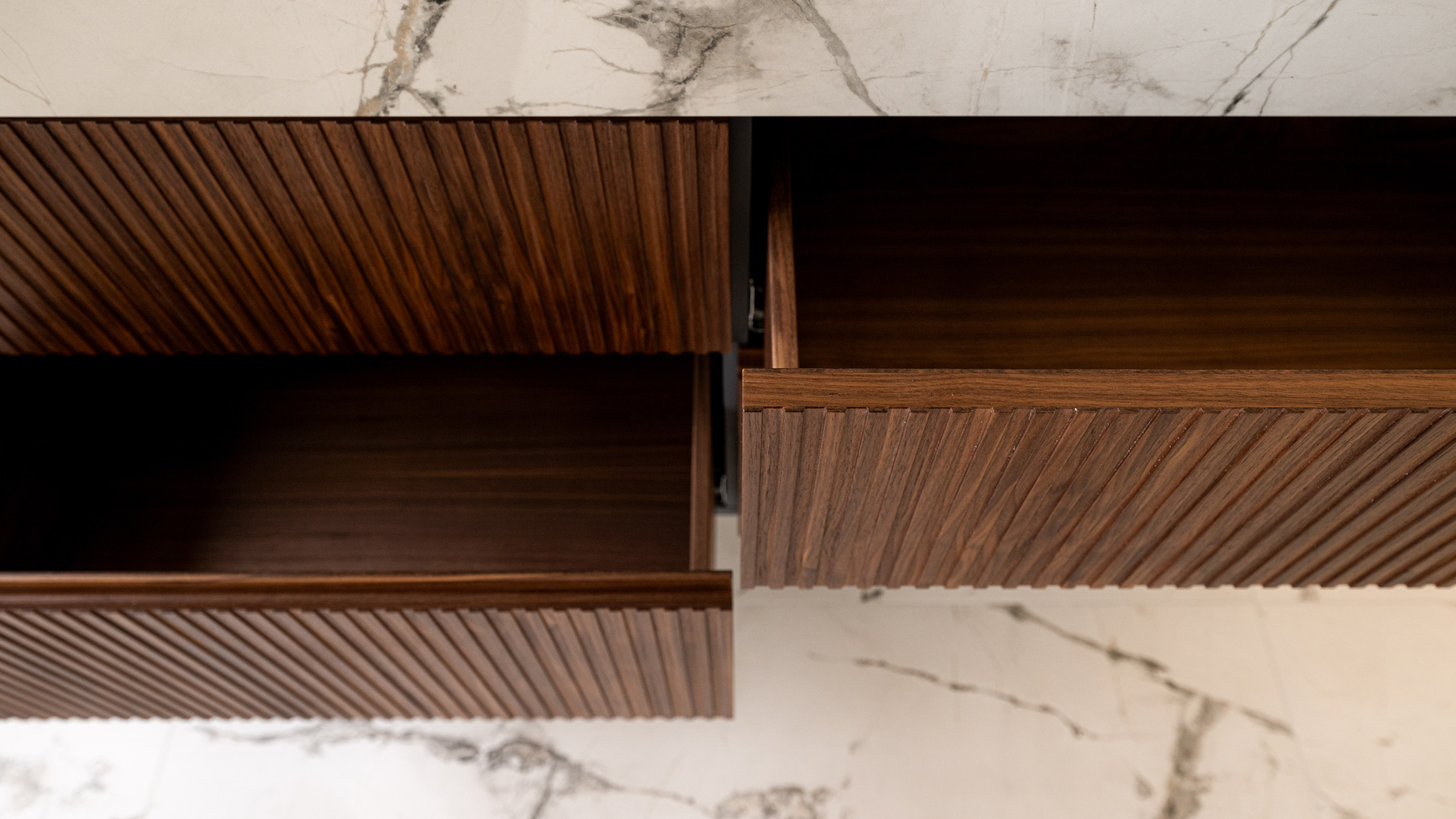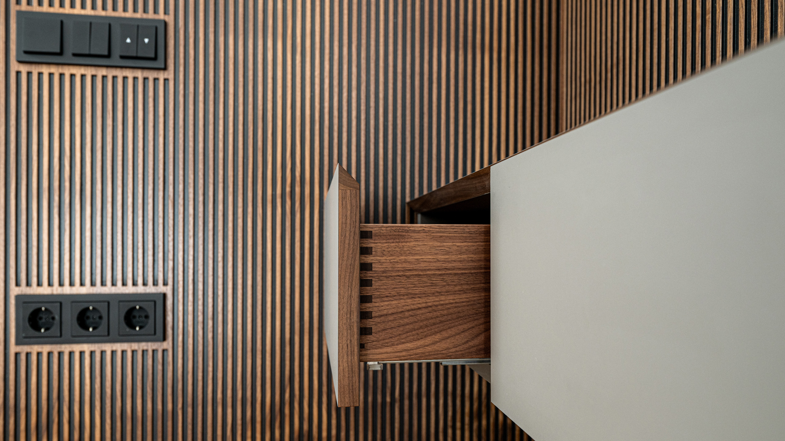 und Farbkonzept. Edle Oberflächen der Schrankeinheiten aus edlem Dekor „Fenix“,
